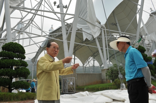 ▲정종득 목포시장이 제15호 태풍 ‘볼라벤’으로 피해를 입은 목포국제축구센터의 하프돔 천정 막구조물이 찢어진 현장을 방문하여 피해상황을 살피고 있다.