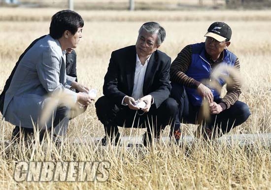 민주통합당 문재인 대선후보가 7일 경북 구미시 산동면 봉산리 불산가스 누출사고 피해 현장을 방문해 말라죽은 농작물을 살펴보고 있다. 장해순 기자