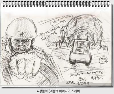 강풀, 전편보다 재미있는 속편을 만들고 싶어! 한편 괴물2의 시나리오를 쓴 강풀은 ‘26년’의 영화화 진행 과정에서 청어람 측에 속편 아이디어를 제안하였다가 전격적으로 괴물2의 시나리오를 작업하게 되었고, 6개월에 걸쳐 금번 시나리오 초고를 내게 되었다. 평소 봉준호 감독의 괴물의 팬으로서 깊은 관심을 가지고 있던 강풀은 "전편의 미덕을 이어가면서도, 속편이 가지는 어려움과 한계를 극복하려 했다. 또한 다수의 괴물을 등장시켜, 전편보다 강화된 액션을 보여주고 싶다." 라며 첫 시나리오 데뷔작에 대한 포부를 밝혔다. 이어서 "괴물2의 여러 아이디어에 대해 아이디어 스케치를 동시에 진행한 부분들이 첫 시나리오 작업에 도움이 된 것 같다." 라며 스케치 한 컷을 공개하였다.
