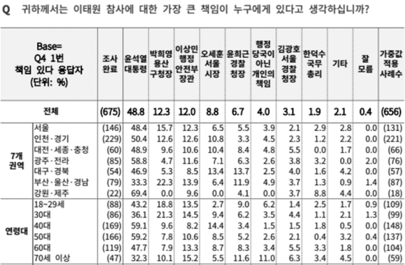 지난 달 29일 158명의 희생자를 가져온 ‘이태원 참사’에 대한 가장 큰 책임이 누구에게 있는지에 대한 여론조사결과 국민 10명 중 5명 가까이가 ‘윤석열 대통령’을 지목했다.