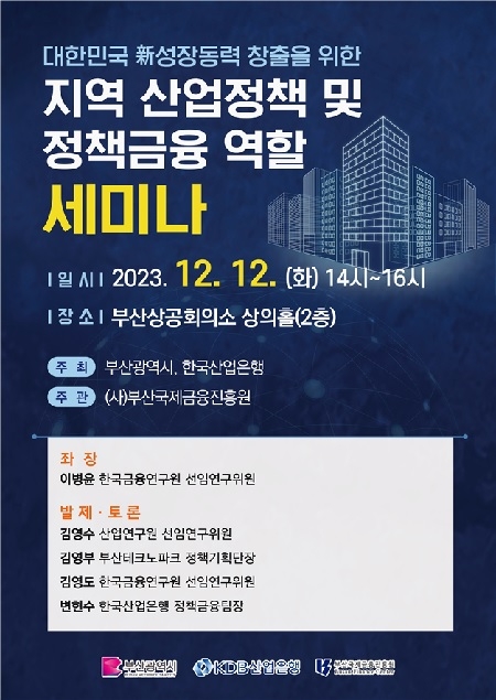 부산시가 12일 부산상공회의소 상의홀에서 한국산업은행과 ‘대한민국 신성장동력 창출을 위한 지역 산업정책 및 정책금융 역할’ 세미나를 개최했다고 밝혔다.