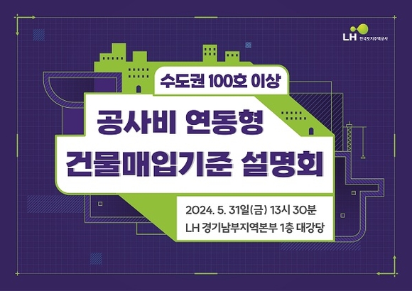 한국토지주택공사(LH)는 오는 31일 경기 성남시 소재 LH 경기남부지역본부 1층 대강당에서 ‘수도권 100호 이상 신축 매입임대 공사비 연동형 건물 매입기준 설명회’를 개최한다고 28일 밝혔다.