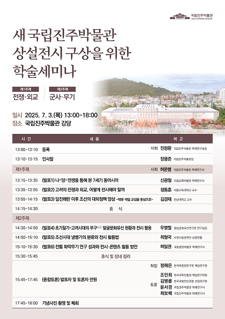주제 발표는 ▲국립김해박물관 신광철 학예연구사의 ‘나羅당唐 전쟁을 통해 본 7세기 동아시아’ ▲서울교육대학교 정동훈 교수의 ‘고려의 전쟁과 외교, 어떻게 전시해야 할까’ ▲전남대학교 김경태 교수의 ‘임진왜란 이후 조선의 대외정책 양상-대명·대일 교섭을 중심으로’ ▲영남문화유산연구원 우병철 연구실장의 ‘초기철기~고려시대의 무구武具 발굴문화유산 현황과 전시 활용’ ▲수원시립공연단 최형국 상임연출의 ‘조선시대 냉병기의 분류와 전시 활용법’ ▲국립중앙박물관 허일권 학예연구사의 ‘전통 화약무기 연구 성과와 전시·콘텐츠 활용 방안’ 순으로 진행된다.