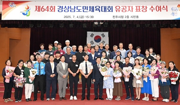 경남 진주시는 4일 시청 2층 시민홀에서 '제64회 경상남도민체육대회 유공 시민 표창 수여식'을 열고, 성공적인 대회 운영을 위해 헌신한 시민들에게 감사의 뜻을 전했다.
