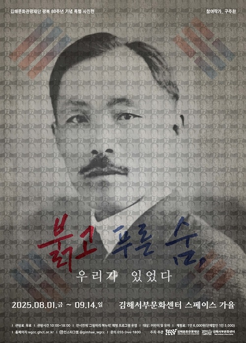 기획전 '붉고 푸른 숨, 우리가 있었다'는 초대작가 구주환의 사진 30여 점과 광복 80주년을 상징하는 세대별 김해시민 80명의 참여로 제작된 인물사진 작품 등이 설치되는 특별 사진전으로 구성돼 있다. 구주환 작가는 이번 전시에 김해를 대표하는 김정태, 배동석, 이윤재 열사를 비롯해 총 12명의 독립운동가에게 헌정하는 인물사진을 제작해 전시한다. 또한 이번전시에서는 독립기념관 소장 유물인 ‘한국광복군 서명문 태극기’ 인쇄본을 현재의 태극기와 함께 설치해 과거와 현대뿐만이 아니라 미래로의 연결이라는 역사적 의미를 더욱 깊게 전할 예정이다.