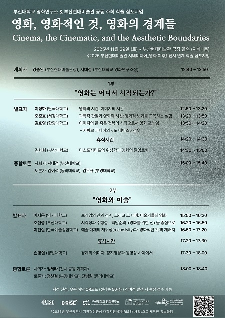 부산대학교 영화연구소와 부산현대미술관은 ‘2025 부산현대미술관 시네미디어_영화 이후’ 전시와 연계해, ‘영화적인 것’의 의미를 새롭게 조명하며 확장되는 영화의 경향을 탐구하는 학술 심포지엄 '영화, 영화적인 것, 영화의 경계들'을 오는 29일 부산현대미술관 지하 1층 극장 을숙에서 공동 개최한다고 18일 밝혔다.