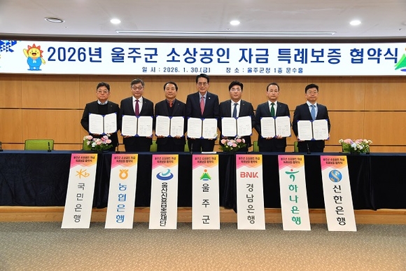 울주군은 이날 군청 문수홀에서 울산신용보증재단과 경남은행, 농협은행, 하나은행, 국민은행, 신한은행 등 5개 금융기관이 참여한 가운데 ‘2026년 소상공인 자금특례보증 지원 업무협약’을 체결했다.