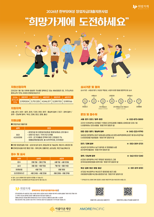 아모레퍼시픽이 아름다운재단과 함께 한부모 여성 창업자금 대출지원사업 ‘희망가게’의 창업주를 오는 27일까지 공개 모집한다고 2일 밝혔다.