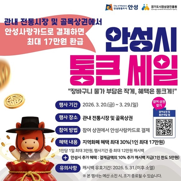 최대한 많은 시민이 혜택을 받을 수 있도록 ‘통큰세일’ 관련 환급 한도는 1인당 1일 최대 3만 원, 행사 기간 총 12만 원으로 제한된다. 여기에 안성시 추가 혜택 최대 5만 원을 더하면 인당 총 17만 원까지 캐시백을 받을 수 있다. 자동 지급된 환급액은 오는 5월 31일까지 사용해야 한다.