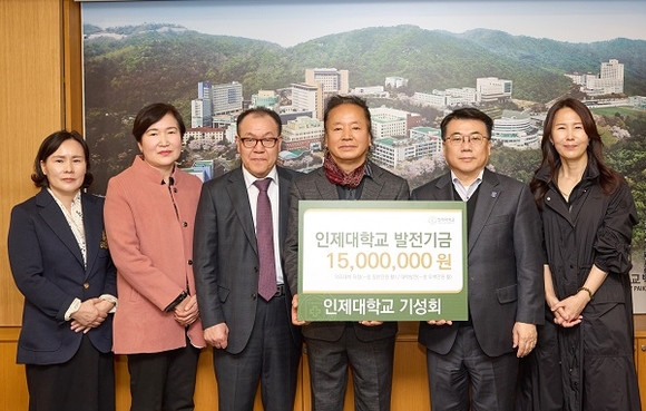 인제대학교 기성회가 20일 대학 본관에서 발전기금 1500만 원을 전달한 뒤 기념촬영을 하고 있다.(사진=인제대 제공)