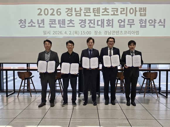 경남문화예술진흥원은 2일 경남콘텐츠코리아랩에서 국립창원대학교 SW중심대학사업단, 경남대학교 SW중심대학사업단, 영산대학교 산학협력단, (사)경남콘텐츠산업협회와 함께 경남 청소년 대상 콘텐츠 경진대회 운영을 위한 업무협약을 체결했다고 밝혔다.