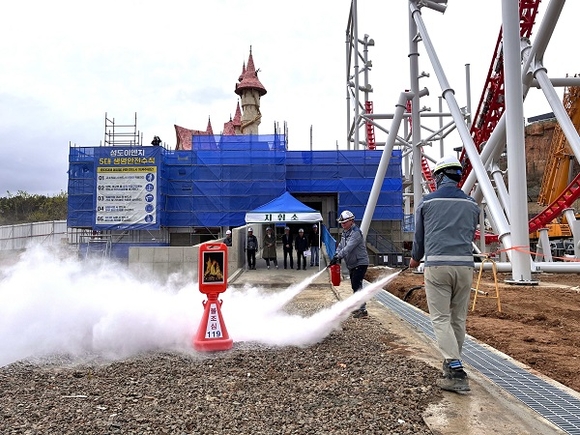 모의 화재 상황에 대응하는 롯데월드 어드벤처 부산 임직원과 소방대원.(사진=롯데월드 부산 제공)