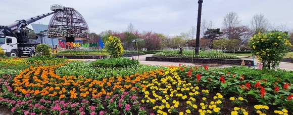 전남 함평군이 대한민국 대표 봄 축제인 나비대축제 개막을 앞두고 함평엑스포공원에 대형 꽃탑을 설치해 눈길을 끌고 있다.
