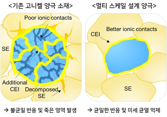기존 다결정(polycrystalline) 고니켈 양극 입자는 전고체전지 내 충·방전 과정에서 리튬 탈삽입에 따른 구조 변화가 충분히 일어나지 못해 적정 용량을 구현하지 못하고, 일부 입자만 반응하는 ‘불균일 반응’이 발생했다. 특히 전고체전지에 필수적인 높은 압력에서는 입자 균열과 고체전해질과의 불균일 접촉으로 전극 내부에 반응하지 못하는 ‘죽은 영역(dead zone)’이 대량으로 생기는 한계가 있었다.
