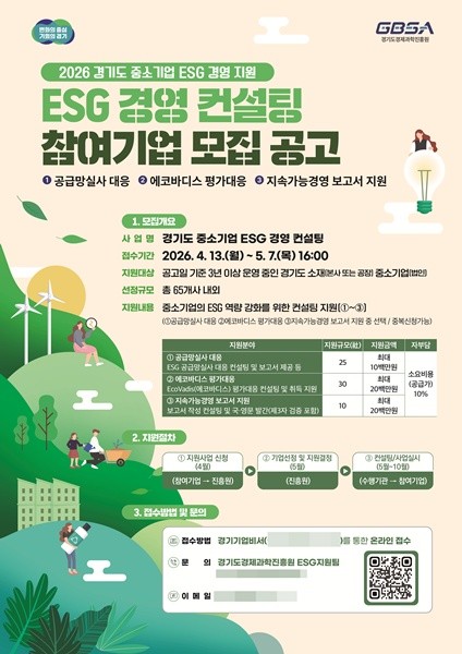 경기도경제과학진흥원이 도내 중소기업의 지속 가능한 경영 기반을 강화하고 급변하는 글로벌 규제에 선제 대응하기 위해 ‘경기도 중소기업 ESG 경영 컨설팅 지원사업’ 참여 기업을 다음달 7일까지 모집한다고 밝혔다.