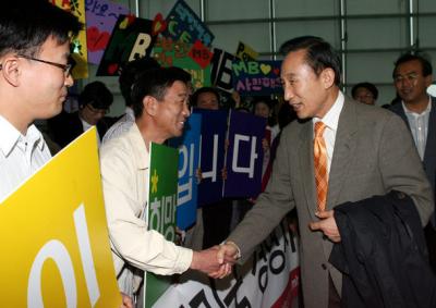 ▲22일 오후 이명박 전 서울시장은 유럽으로 떠나기전에 인천국제공항에서 지지자들로부터 환송을 받고 있다.