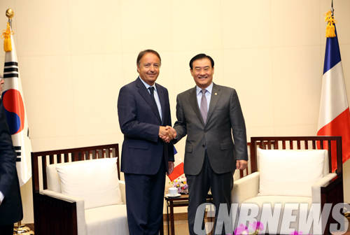 ▲강창희 국회의장이 23일 서울 여의도 국회의장접견실에서 국회 초청으로 한국을 방문 중인 장 피에르 벨(Jean Pierre BEL) 프랑스 상원의장 일행을 접견하고 양국 간 실질 협력 방안에 대해 논의했다.(사진=국회)