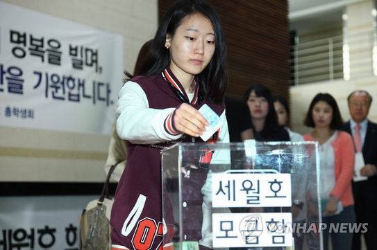 ▲대전 한남대 학생들이 23일 세월호 희생자들의 명복을 빌고 실종자들의 무사귀환을 기원하며 모금운동을 벌이고 있다. (사진=연합뉴스)
