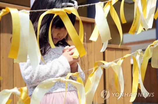 ▲23일 제주시내 한 어린이집에서 한 어린이가 세월호 침몰사고 실종자들의 무사 귀환을 기원하는 노란 리본을 묶은 뒤 손을 맞잡고 기도하고 있다. (사진=연합뉴스)