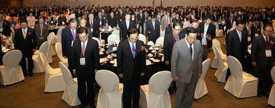 ▲지난 22일 세계한인무역협회(월드옥타) 제16차 세계대표자대회 및 수출상담회에 참석한 기업인들이 세월호 참사 희생자에 대한 묵념을 하고 있다. (사진=연합뉴스)