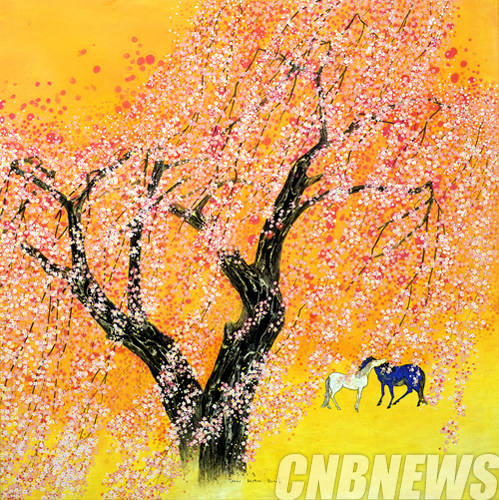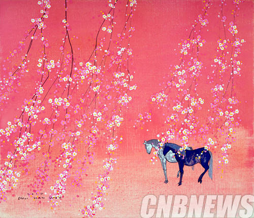 캔버스 바탕에 깔린 미디엄은 예기치 못한 상황성을 마련해주며 재질감에 조응애 나가면서 혹은 부분적인 수정을 가하면서 자신의 기호적 도상인 매화 등을 그려나간다.