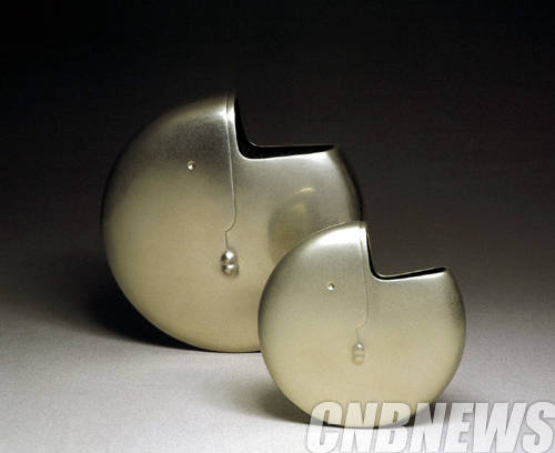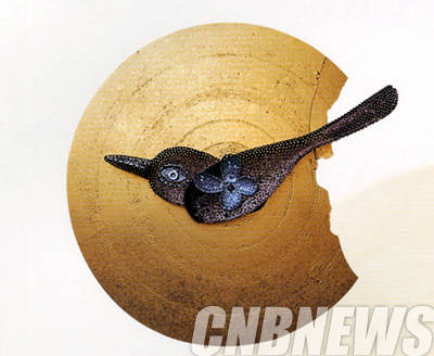 ▲강창균, '반달은 십오일,온달은 삼십일'. 30x30x5cm, 백동, 순금박, 무쇠솥뚜껑, 1997.
