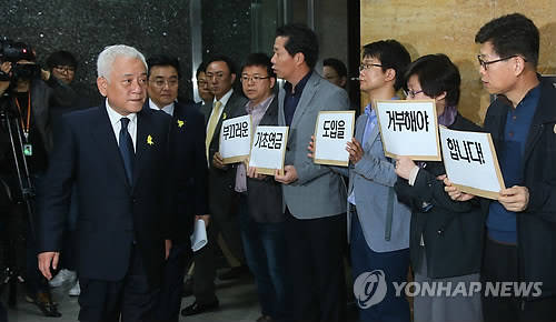 ▲김한길 새정치민주연합 공동대표(왼쪽)와 전병헌 원내대표(바로 뒷쪽)가 28일 오전 국회에서 '국민연금 연계 기초연금 반대' 피켓을 들고 있는 국민연금 바로세우기 국민행동 회원들 앞을 지나 의원총회장으로 들어가고 있다(사진=연합뉴스)