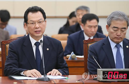 ▲서남수 교육부 장관(왼쪽)은 28일 국회 법제사법위 전체회의에 출석해 세월호 참사 피해자 가족들이 모여있던 진도 실내체육관에서 소위 ‘황제라면’이라고 불리웠던 ‘컵라면’을 먹어 부적절한 처신 논란을 빚은데 대해 “보여드리지 말았어야 할 모습을 보여드린데 대해 대단히 민망하고 부끄럽게 생각한다”고 사과했다. 오른쪽은 답변을 준비하고 있는 유진룡 문화관광부장관. (사진=연합뉴스)