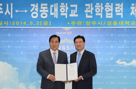 양주시(시장 현삼식)는 2일 시청 제2상황실에서 경동대학교(총장 전성용)와 학술·정보·인력 등을 상호 교류·협력하고 지역사회 발전을 위한 연구활동과 기술인력 양성을 위한 ‘양주시↔경동대 관학협력 협약’을 체결했다.