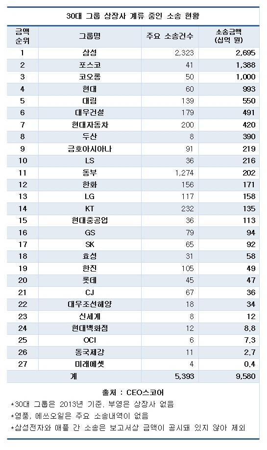 8일 기업경영성과 평가사이트인 CEO스코어가 국내 30대 그룹 189개 상장 계열사의 2013년 말 현재 계류 중인 소송 사건을 조사한 결과 주요 피소 건 수는 5393건, 피소금액은 9조5803억원으로 나타났다.
