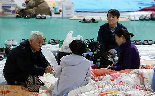 ▲새정치민주연합 김한길·안철수 공동대표가 8일 오전 전남 진도군 진도실내체육관을 찾아 실종자 가족을 위로하고 있다.(진도=연합뉴스)