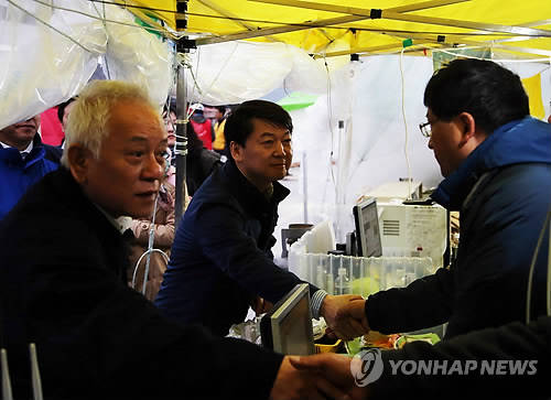▲새정치민주연합 김한길·안철수 공동대표가 세월호 참사 발생 23일째이자 어버이날인 8일 오전 전남 진도 팽목항을 찾아 자원봉사자를 격려하며 악수하고 있다.(진도=연합뉴스)