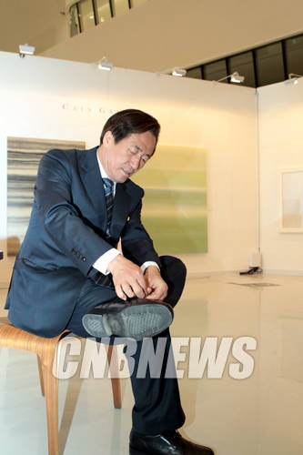 8일 오후 서울 동대문 디자인 플라자(DDP)에서 진행된 G-SEOUL2014 개막식에 참석한 새누리당 서울시장 예비후보 정몽준 의원이 신발끈을 고쳐 매고 있다.