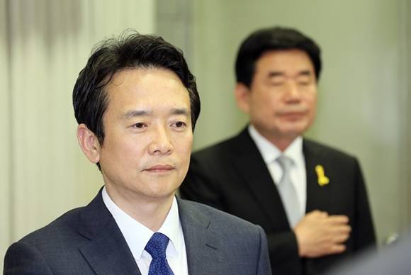 ▲12일 열린 초청토론회에서 남경필 의원(앞)과 김진표 의원이 토론회에 앞서 국기에 대한 맹세를 하고 있다.(사진=남경필 경기도지사 후보 사무소 제공)