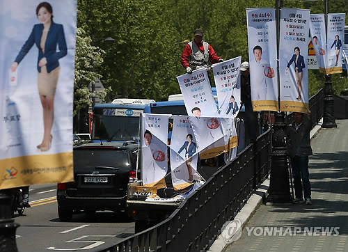 ▲6·4 지방선거를 앞두고 서울 종로구 창경궁로 거리에서 서울시선거관리위원회 관계자들이 가로등에 투표를 독려하는 현수기를 설치하고 있다. (사진=연합뉴스