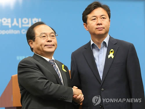 ▲부산시장 여론조사 결과 무소속 시민후보로 나선 오거돈 후보의 지지율이 야권단일화를 이뤄 새누리당 서병수 후보와 양자 대결을 벌일 경우 10%포인트 이상 앞서고 있는 것으로 나타나 여권을 긴장 속으로 몰아넣고 있다. 16일 오전 오 후보와 새정치민주연합 김영춘 후보가 야권단일화 했음을 발표하며 악수하고 있다.(부산=연합뉴스)