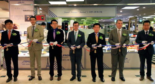 사진 왼쪽에서 세 번째부터 박동운 현대백화점 상품본부장, 제롬 파스키에 대사, 김영태 사장, 다비드 피에르 잘리콩 한불상공회의소 회장.