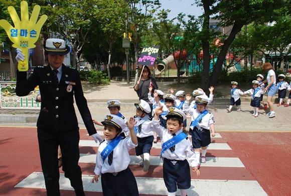 교통안전계(경장 조지영)에서는 경찰 제복을 입은 꼬마 경찰관들과 어린이집 주변을 걸으며 지나가는 어른 및 운전자에게 『신호를 잘 지켜주세요』,『정지선을 지켜주세요』,『속도를 줄여주세요』등을 외치고 어린이들이 직접 크레파스와 색연필 로 그려서 만든 전단지를 나눠주었다. 아울러 횡단보도에서 “안전한 도로횡단 5원칙”에 대해 배우고 직접 실습해 보는 시간을 가졌다.