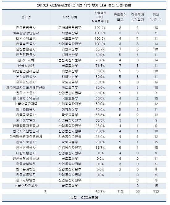 기업경영성과 평가사이트인 CEO스코어가 2012~2013년 국내 시장·준시장형 공기업 30개사의 기관장과 상임·비상임 이사, 감사 등의 임원 현황을 조사한 결과, 전체 임원수 333명 중 34.5%인 115명이 관료 출신으로 나타났다.