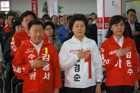 ▲21일 김용서 새누리당 수원시장 후보 선거사무소에서 김 후보와 6·4지방선거에 출마한 경기도의원과 수원시의원에 출마한 새누리당 후보들이 한 자리에 모여 필승을 다진 가운데 국민의례를 하고 있다.(사진제공= 김용서 수원시장 후보 선거사무소)