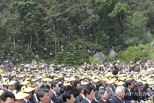 ▲지난해 5월23일 봉하마을 부엉이 바위 밑에서 참배객들이 노무현 전 대통령 서거 4주기 추모식을 지켜보고 있다.(자료사진=연합뉴스)