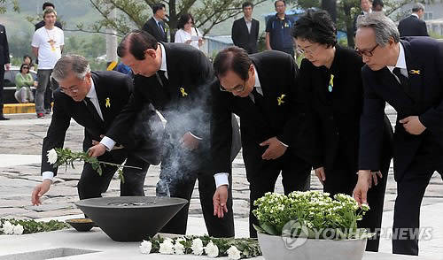 ▲23일 오후 경남 김해시 진영읍 본산리 봉하마을 노무현 전 대통령 묘역에서 열린 '노무현 전 대통령 5주기 추도식'에서 새정치민주연합 문재인(맨 왼쪽) 의원과 김원기·임채정 전 국회의장 등이 노 전 대통령의 묘역에 헌화하고 있다. (경남 봉하=연합뉴스)