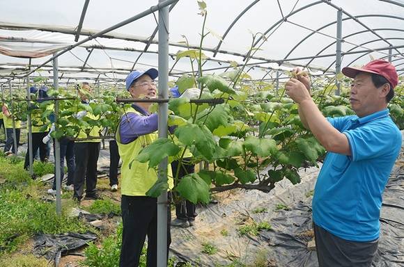 영업본부 직원들이 춘계체육행사를 반납하고 실시한 이날 일손돕기는 포도 곁순따기, 육손따기, 지네발 제거, 배수로 정비 작업 등 많은 영농인력이 필요한 농작업을 실시했다.