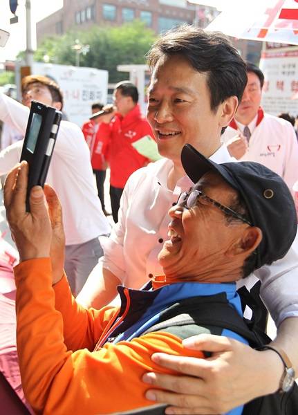 ▲29일 유세현장에서 어르신의 요청으로 다정하게 포즈를 취하고 있는 남경필 경기도지사 후보(사진=남경필 후보 선거사무소 제공)