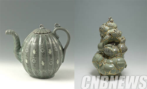 ▲좌측, 청자 상감 국화연화문 과형주자, 고려시대 12-13세기. 우측, 이수경 'Translated vase'.2014.
