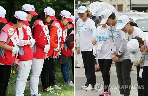 ▲6·4 지방선거 D-3일이자 휴일인 1일 서울시장을 두고 맞붙은 새누리당 정몽준 후보측과 새정치민주연합 박원순 후보측의 유세가 계속됐다. 새누리당 정몽준 후보 선거운동원들이 이날 서울 서초구 관문사 입구에서 '기호1번 정몽준'이 새겨진 모자와 옷을 입고(사진 왼쪽), 새정치민주연합 박원순 후보측 선거운동원들이 서울 왕십리역 광장에서 '기호2번 박원순'이 새겨진 모자와 옷을 같이 입고 각각 유권자들의 지지를 호소하고 있다.(사진=연합뉴스)