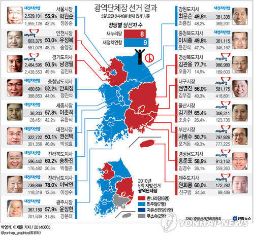 이 발표에 따르면 새누리당은 ▲부산 서병수 ▲대구 권영진 ▲인천 유정복 ▲울산 김기현 ▲경기 남경필 ▲경북 김관용 ▲경남 홍준표 ▲제주 원희룡 후보가 각각 승리를 확정지었으며, 새정치연합은 ▲서울 박원순 ▲광주 윤장현 ▲대전 권선택 ▲세종 이춘희 ▲강원 최문순 ▲충북 이시종 ▲충남 안희정 ▲전북 송하진 ▲전남 이낙연 후보가 각각 여당 후보를 누르고 승리했다.