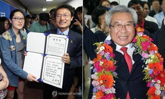충북에서는 전교조 지부장 출신인 김병우(44.5%) 후보가 보수 장병학 후보(30.9%)에 승리했고, 제주에서도 진보 이석문 후보(33.2%)가 보수 고창근 후보(26.9%)를 누르고 교육감 자리에 올랐다.