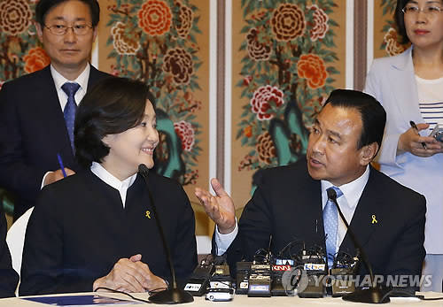 ▲새누리당 이완구, 새정치연합 박영선 원내대표는 9일 오전 국회 사랑재에서 세월호 참사 후속 대책과 19대 국회 후반기 원구성 문제 등을 논의하기 위한 첫 주례회담을 열어 눈길을 끌었다.(사진=연합뉴스)