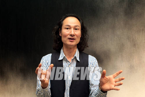 ▲9일 서울 통의동 아트사이드 갤러리에서 진행된 '달빛-물에 비치다'전 설명회에 함께한 이재삼 작가가 전시작품에 대해 설명을 하고 있다.(사진=왕진오 기자)